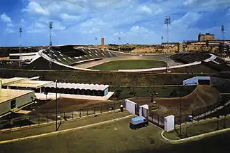 The velodrome was constructed between 1957 and early 1960. Soon after it was built problems were found, as water was draining away the foundations on one side of the velodrome. Concrete was injected into the foundations, which solved the problem only temporarily. It was last used for competition in 1968, when it hosted the UCI Track Cycling World Championships.[1] After this it was abandoned, until it was imploded on 24 July 2008.
