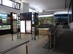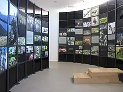 The design of the exhibition was designed by the Goulandris Museum of Natural History.[2] The exhibition is divided into seven areas, in which the peculiarities of the seven different zones of the mountain are presented, one will find large-sized boards that provide information about relevant topics in Greek and English. With every rise in the exhibition, the next higher altitude of the mountains is shown and the plant and animal world prevailing there is explained. Places of interest beyond nature are treated on separate boards, information about archaeological sites such as Dion or Leivithra is provided. The hiker is pointed out to interesting places near the hiking trails, such as the monastery of Agios Dionysius or the cave of the painter Ithakisios.