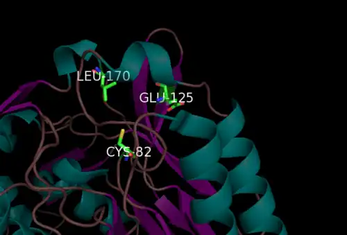 Just as omega-amidase shares a general structure organization as other nitrilases, omega-amidase also contains the same catalytic triad within the active site. This triad of residues includes a nucleophilic cysteine, a glutamate base, and a lysine, all of which are conserved within the structure.[2] In addition to the catalytic triad, omega-amidase also contains a second glutamate that assists in substrate positioning.[3] This second glutamate is why omega-amidase has no activity with glutamine or asparagine, even though they are sized similarly to typical substrates.[4]
