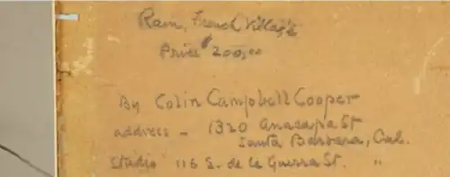 The back of this painting is a short, handwritten note by Colin Campbell Cooper. The pencil markings state: "Rain, French Village Price $200.00," followed by his name, address, and the location of his studio. This painting is oil on board and measures 39 cm × 49 cm (15.5 in × 19.5 in). This piece has been auctioned in the past and is privately owned.[4]