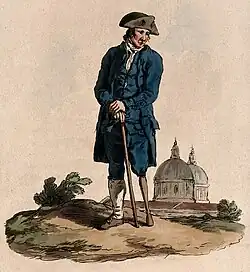 Two teams of Greenwich pensioners played at a ground formerly part of Lewisham Priory. The match was organised by Messrs Ingersoll and Stanton who managed to attract two thousand, four hundred spectators who were attracted by the novelty of the event. The game was played over two days and the teams were well-provisioned throughout, being given a hearty lunch before play and dinners of roast beef and lamb with plenty of strong ale at the Bull Inn. A band provided music for the occasion and the cricket players were additionally rewarded with a glass of grog and a fee of ten shillings. The one-legged men had difficulty connecting with the wide bowling, often being got out as they span around like a top. The one-armed team was the betting favourite and won the match, scoring 50 runs in their first innings and 41 in the second. The score of the one-legged team was 32 and 44, making the result 91 to 76 in favour of the one-armed team.[2][7][8]