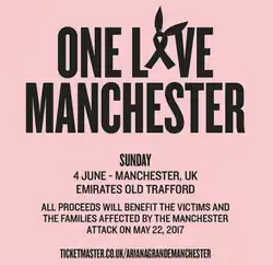 Event tickets were made available on 1 June 2017 for £40, and sold with no booking fees. These tickets sold out within 6 minutes of going on sale.[22] Fans who were at the concert of 22 May could apply to attend at no cost. The application ended on 31 May at 17:00, but was extended till 22:00 to allow as many people at the concert on the 22nd to apply to be there as possible.[8][23] Metrolink offered free travel for concertgoers to and from the Old Trafford tram stop.[24] Uber also said that fares for passengers travelling to and from the concert will be donated to charity.[25]
