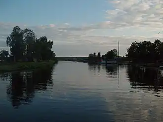The Onega Canal (Russian: Онежский канал) is a canal that runs along the southern banks of Lake Onega in Vytegorsky District of Vologda Oblast and Podporozhsky District of Leningrad Oblasts in Russia. It was built 1818–1820 and 1845–1852 as a part of Mariinsk Canal System, to allow small riverboats to avoid Lake Onega, where storms are frequent and where many boats had perished through the centuries. The canal is 69 kilometres (43 mi) long[1] and runs between the Vytegra River in the east and Svir River in the west. It is around 50 metres (160 ft) wide, and lies between 10 metres (33 ft) and 2 kilometres (1.2 mi) from the shores of the lake.[2] At the mouth of the canal, in the selo of Voznesenye, a memorial obelisk has been erected.
