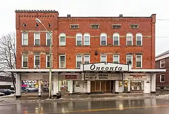 Oneonta Theatre is a historic theatre building located at Oneonta in Otsego County, New York. The original structure was built about 1897 and expanded in several stages. The original three story structure was a generally rectangular block with storefronts and theater entrance on the first floor and apartments above. A theater wing projected from the rear was set at a 45-degree angle. In 1922, the theater was expanded and the entrance relocated to the center of the building. The 1922 marquee was removed in the 1970s.[2]