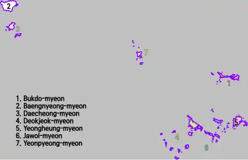 Ongjin County (Korean옹진군) is a county in Incheon Metropolitan City, South Korea. It consists of a group of islands in the Yellow Sea (West Sea).