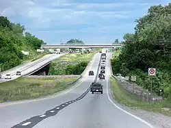 In Hamilton, work was underway on an extension of the Chedoke Expressway to Mohawk Road, crossing the Niagara Escarpment. This tedious project, which required extensive rock blasting, was soon accompanied by construction from Mohawk Road to Highway 2 near Ancaster. Both projects were completed together and originally scheduled to be opened with a ribbon-cutting ceremony on August 22, 1969.[35] However, local residents complained the new section lacked any barriers preventing children from wandering onto the highway, postponing the ceremony until August 27 as temporary snow fencing was erected. This proved inadequate, and protests grew more vocal over the following week. Several petitions were presented to Deputy Highway Minister H. Howden on August 26, and the ceremonies were cancelled.[36] Over the following week, Minister of Highways George Gomme met with residents and reached a compromise whereby a 24-hour patrol was established to watch for children until a proper fence could be constructed. The route was opened on September 3, without any ceremony.[37] This completed the Hamilton section of Highway 403.[16] As completed, the western terminus of the Chedoke Expressway defaulted to Wilson Street (Highway 2) via a trumpet interchange near Ancaster, although the Wilson Street overpass was designed to accommodate a future extension of the Chedoke Expressway.[38][39]