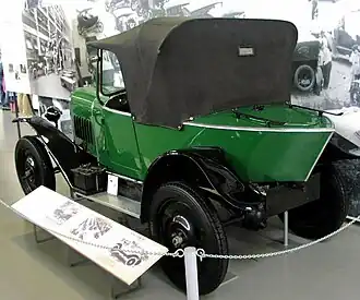 Three seater bodies were offered, the third seat positioned behind the front two, and the bodywork a choice between an enclosed "Limousine" sedan/saloon and an open topped body. From 1925 the 2,510 mm (98.8 in) wheelbase cars were available with two and, for the first time on a Laubfrosch, four-seater bodies. There was now also a small delivery van. The cars were no longer only available in green. The three-seater "Limousine"-bodied cars were delivered in Steel Grey with a black roof while the delivery van variants were Reddish Brown".[9]