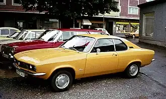 The Manta A was released in September 1970, two months ahead of the then new Opel Ascona on which it was based. A competitor to the Ford Capri, it was a two-door "three-box" coupé, and featured distinctive round tail lights, quite similar to those on the Opel GT and which in fact were used on the GT in 1973, its final model year. It took its name, and a few minor styling cues, from the Manta Ray concept car (1961), which also famously influenced the 1968 Chevrolet Corvette C3 (both Chevrolet and Opel had General Motors as their parent company).[4] 498,553 Manta As were built from 1970 until 1975.[4]