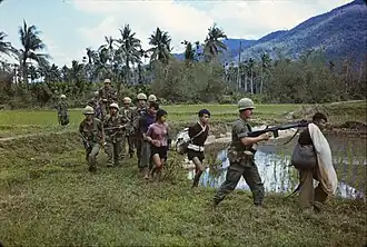 A problem faced in Operation Irving was the large number of non-combatants, mostly farmers, in the heavily populated coastal area. Leaflets and radio programs instructed the civilians to stay put in their villages or if caught in a battle for the village to leave only in the direction of allied soldiers.[6]