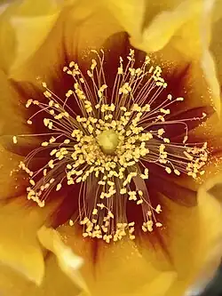 Close up on a flower of Opuntia azurea in Majorelle's garden.