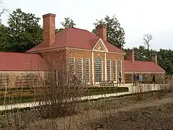 George Washington designed and constructed an orangery for his home at Mount Vernon, Virginia. It was designed in the Georgian Style of architecture and stands just north of the mansion facing the upper garden. Completed in 1787, it is one of the largest buildings on the Mount Vernon estate. Washington grew lemon and orange trees and sago palms there. Considered an ambitious structure by his contemporaries, the main room featured a vaulted ceiling for air circulation, and incorporated radiant heating from a series of flues under the floor. The original greenhouse burned in 1835, but was rebuilt on the same site in 1951 using original plans.[25]