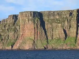 The Orcadian Basin is a sedimentary basin of Devonian age that formed mainly as a result of extensional tectonics in northeastern Scotland after the end of the Caledonian orogeny. During part of its history, the basin was filled by a lake now known as Lake Orcadie. In that lacustrine environment, a sequence of finely bedded sedimentary rocks was deposited, containing well-preserved fish fossils, with alternating layers of mudstone and coarse siltstone to very fine sandstone.[1] These flagstones split easily along the bedding and have been used as building material for thousands of years.[2] The deposits of the Orcadian Basin form part of the Old Red Sandstone (ORS). The lithostratigraphic terms lower, middle and upper ORS, however, do not necessarily match exactly with sediments of lower, middle and upper Devonian age, as the base of the ORS is now known to be in the Silurian and the top in the Carboniferous.[3]