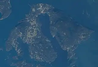 With an area of 57.3 square miles (148 km2) and a population of 6000[4] (2020 census), Orcas Island is slightly larger, and less populous, than neighboring San Juan Island. It is shaped like a pair of saddlebags, separated by fjord-like Eastsound, and two prominent bays, Westsound and Deer Harbor, on the southwest side. At the island's northern end is the village of Eastsound, the largest population center on Orcas and the second largest in San Juan County.