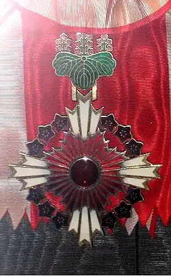 The Order of the Paulownia Flowers (桐花章, Tōka shō) is an order presented by the Japanese government. The award was established in 1888 during the Meiji Restoration as the highest award in the Order of the Rising Sun and has been an Order in its own right since 2003.[1] The only grade of the order is Grand Cordon of the Order of the Paulownia Flowers (桐花大綬章, Tōka daijushō), which ranks higher than the Order of the Rising Sun, the Order of the Sacred Treasure, the Order of the Precious Crown, and the Order of Culture and lower than the Order of the Chrysanthemum.