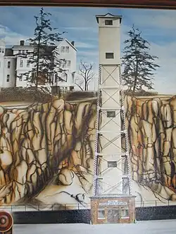 The original elevator that was constructed in this area was built as a means of transportation for the residents in the city. The alternative option before the build, would have been walking the stairs from the base to the top of the cliff which consisted of 722 steps.[6] The first bond issued "A public elevator at the bluff".[6] A bond measure to raise $12,000 for construction was put to voters in July 1912. This levy failed, but a second referendum passed in December of the same year. Sara Chase was the owner of the planned building site, but refused to give up her property for the elevator. After the city went through the Oregon Supreme Court, it was ruled that they could create a right-of-way to the elevator. She agreed to give up a narrow portion of her land.[7] The elevator opened to the public in 1915, delayed by politics. The original elevator was water-powered and took three minutes for the ride. The elevator took three years to build and was constructed out of wood and steel.[7] In the event that the elevator stopped working during the ride, passengers would have to exit through a trap door that had a narrow ladder where the passengers would climb down to safety.[8] Located at the top of the elevator was a catwalk that extended 35 feet (11 m) stretching across and connecting the elevator to the cliffside.[6] The elevator was so popular that most of the cliffside stairs were removed. The elevator was converted to electric drive in 1924, which reduced the time to 30 seconds.[5] After many years of use, in the 1950s it was decided that the elevator would be replaced with a new one.[6]