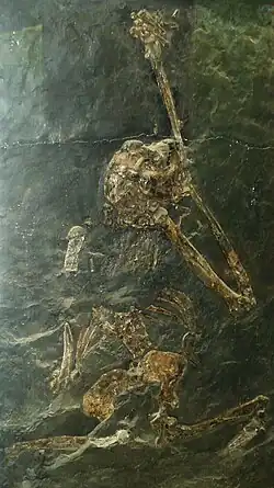 From 1949 onwards, Swiss paleontologist Johannes Hürzeler began to restudy the known material.[10][11] In 1954, 1955, 1956, and 1958, he claimed Oreopithecus were a true hominin—based on its premolars, short jaws and reduced canines, at the time considered diagnostic of the hominin family.[12][13][14] This hypothesis immediately became a hotly discussed topic among his fellow paleontolgists.[15][16][17][18][19] When he toured the world to give a series of lectures, his views generated an enormous press coverage, often being presented as a challenge to the Darwinian descent of man from apes.[20] After Hürzeler was invited to give a lecture in New York in March 1956, the Wenner-Gren Foundation decided to finance excavations in Italy, with the cooperation of the Italian paleontologist Alberto Carlo Blanc. On 2 August 1958, Hürzeler's views seemed to be confirmed when he discovered a complete skeleton in Baccinello,[21] which in 1960 he interpreted as a biped because of the short pelvis was closer to those of hominins than those of chimpanzees and gorillas.[22] Hominin affinities claimed for Oreopithecus remained controversial for decades until new analyses in the 1990s reasserted that Oreopithecus was directly related to Dryopithecus. The peculiar cranial and dental features were explained as consequences of insular isolation.