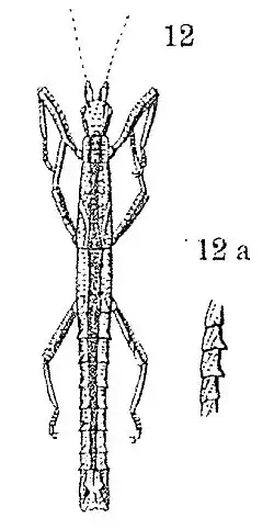 - ^ Zompro, O. (2004). Revision of the genera of the Areolatae, including the status of Timema and Agathemera (Insecta, Phasmatodea), Goecke & Evers, Keltern-Weiler, pp. 221–223, ISBN 978-3931374396
