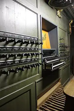 • Windchests: Rugpositief (1730), Hoofdwerk (1984), Bovenwerk (1976) and Pedaal (1692, 1730, 1854)