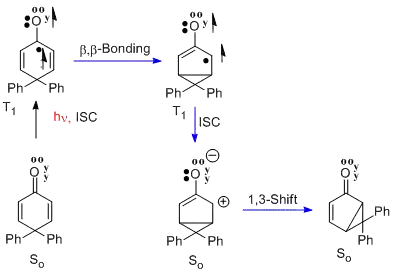 Quite parallel to the santonin to lumisantonin example is the rearrangement of 4,4-diphenylcyclohexadienone[9] Here the n-pi* triplet excited state undergoes the same beta-beta bonding. This is followed by intersystem crossing (i.e. ISC) to form the singlet ground state which is seen to be a zwitterion. The final step is the rearrangement to the bicyclic photoproduct. The reaction is termed the type A cyclohexadienone rearrangement.