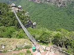 Oribi Gorge is a canyon in southern KwaZulu-Natal, South Africa, 35 kilometres north-west of Port Shepstone, which itself is 120 km south of Durban. Oribi Gorge, cut by the Mzimkulwana River, is the eastern gorge of two gorges that cut through the Oribi Flats (flat sugarcane farmlands) of KwaZulu-Natal. The western gorge was formed by the Mzimkulu River. The gorge is approximately 400 metres (1,300 ft) deep, and almost 5 kilometres (3.1 mi) wide at its widest.
