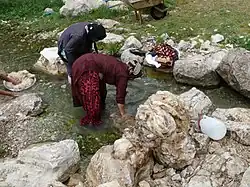 Qashqaï women washing wool in the spring of Sarab Bahram (Cheshm-e Sarab Bahram), region of Noorabad, Fārs province, Iran