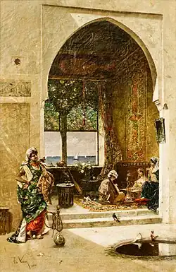 Eugène Delacroix's first great success, The Massacre at Chios (1824) was painted before he visited Greece or the East, and followed his friend Théodore Géricault's The Raft of the Medusa in showing a recent incident in distant parts that had aroused public opinion. Greece was still fighting for independence from the Ottomans, and was effectively as exotic as the more Near Eastern parts of the empire. Delacroix followed up with Greece on the Ruins of Missolonghi (1827), commemorating a siege of the previous year, and The Death of Sardanapalus, inspired by Lord Byron, which although set in antiquity has been credited with beginning the mixture of sex, violence, lassitude and exoticism which runs through much French Orientalist painting.[46] In 1832, Delacroix finally visited what is now Algeria, recently conquered by the French, and Morocco, as part of a diplomatic mission to the Sultan of Morocco. He was greatly struck by what he saw, comparing the North African way of life to that of the Ancient Romans, and continued to paint subjects from his trip on his return to France. Like many later Orientalist painters, he was frustrated by the difficulty of sketching women, and many of his scenes featured Jews or warriors on horses. However, he was apparently able to get into the women's quarters or harem of a house to sketch what became Women of Algiers; few later harem scenes had this claim to authenticity.[47]