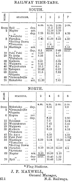 40. ^ "RAILWAY TIME-TABLE. WAIPAWA MAIL". paperspast.natlib.govt.nz. 29 April 1882. Retrieved 19 September 2021.