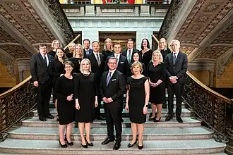 Out of the total 19 ministerial posts, eight ministers are from the National Coalition, seven from the Finns, three from the Swedish People's Party, and one from the Christian Democrats.[1][2][3][4]