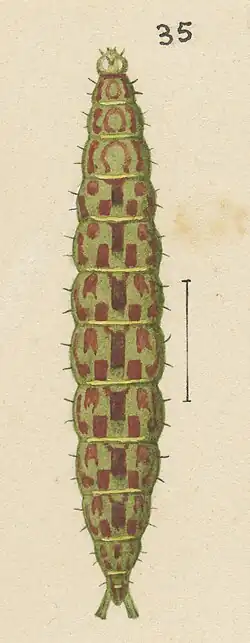 Length when full-grown about 12 inch (11 mm.). Cylindrical, slightly flattened, moderately stout, but strongly tapering at each end, especially posteriorly; segments deeply excised. Head small, ochreous-green; body grass green with darker dorsal stripe. Two or three days before spinning up the larva developes a rather complicated pattern of crimson markings as follows:—Segments 2, 3 and 4 each with an oval mark on midback; segments 5-11 inclusive with a rather long dull crimson bar on midback, and four shorter, more or less square crimson marks arranged on each side of this; segments 11 and 12 have a triangular dorsal mark; there is a very irregular broken lateral line on the sides of all segments except the head. The anal prolegs are long and conspicuously visible from above.[6]
