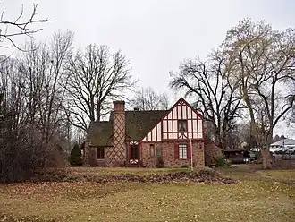 The Orville Jackson House in Eagle, Idaho, is a brick and stucco, 1+12-story Tudor Revival structure designed by Tourtellotte and Hummel and constructed in 1932. The house features a decorative diamond pattern of clinker brick visible on the chimney. Projecting clinkers are evident also in the brickwork of the first floor outer walls. The house was added to the National Register of Historic Places in 1982.[2]