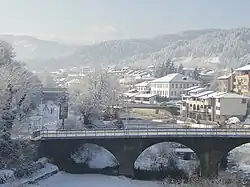Further downstream in Lovech, the river is crossed by the 19th century Covered Bridge and is overlooked by the Lovech Fortress, a major medieval Bulgarian stronghold.[9][10] On the high right shore of the Osam near the village of Devetaki is located the Devetashka cave, one of the country's most picturesque caves. Along its tributary the Maarata near the village of Krushuna are the Krushuna Falls, an attractive travertine cascade.[11]
