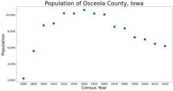 Osceola County (/ˌɒsiˈlə/ OSS-ee-OH-lə) is a county located in the U.S. state of Iowa. As of the 2020 census the population was 6,192, making it the state's fifth-least populous county.[1] It is named for Seminole war chief Osceola. The county seat is Sibley, named for H. H. Sibley of Minnesota.[2]