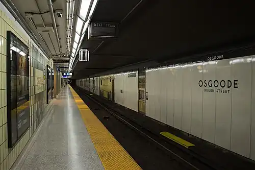When Osgoode was built, some utility lines were relocated away from the station to allow for a future "Lower Osgoode" station on the projected but never-built Queen Street subway, but unlike at Lower Queen, no actual construction took place. When it opened, Osgoode, like St. Andrew station, boasted Vitrolite tiles on its walls.[3] Cracks resulting from the high water table at the station forced the TTC to cover over most of these tiles in the 1970s with vertical slats along the outer walls on the far side of the tracks and ceramic tiles on structural elements on the platform itself. In 2016, the slats on the outer walls were replaced by off-white panels, evoking the original design.[4]