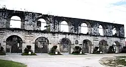 Located front right of the church of Oslob, just outside the perimeter stone fence and near the sea, at the intersection of Calle Aeternidad and the end of Calle Aragones, stands an unfinished building made of coral blocks resembling a Spanish-era barracks. This was intended to be the cuartel, barracks for Spanish soldiers or guardia civil. It was started about 1860, but remained unfinished at the end of Spanish occupation in 1898.[24]