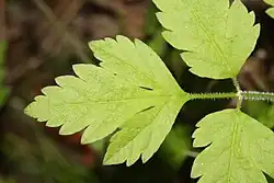It is an aromatic perennial herb producing a branching stem which may exceed a meter tall. The plentiful green leaves have blades up to 20 centimeters long which are divided into three leaflets (trifoliate), which are toothed or lobed. The blade is borne on a long petiole. The inflorescence is a compound umbel of many tiny white flowers at the tip of a stemlike peduncle. There are 4–10 florets on each umbellule with the central florets only possessing anthers.[5] The narrow, elongated fruit is ribbed and bristly, measuring up to 2.5 centimeters long.[10][11]