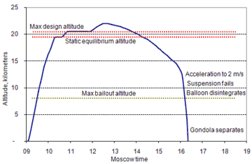 At 9:07 Moscow Time Osoaviakhim-1 lifted off and soon made radio contact with the airfield. By 9:56 the aircraft reached 15,000 metres according to on-board altimeter; at around 17,700 metres its envelope expanded into a nearly perfect sphere and eventually reached static equilibrium at 19,500 metres, exactly as intended by design. The crew experienced problems with carbon dioxide absorbers, but it appeared to be manageable.[3] Fedoseenko dumped 310 kilograms of ballast and by 10:50 the balloon passed its design altitude of 20,500 metres. This moment was later marked as the point of no return: at 20,500 metres Osoaviakhim-1 carried just enough ballast to stabilize descent speed. Further ascent and inevitable loss of hydrogen made this ballast insufficient; the only escape route was through bailing out on personal parachutes, provided that the crew could open the awkward hatch.[7] After nearly an hour at 20,600 metres Osoaviakhim-1 climbed again, reaching 22,000 metres at 12:33 and hovered at this record altitude for 12 minutes.[3][7]