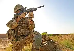 Developed by June 2009 and introduced in April 2010, Osprey Assault Mk 4 body armour (later simplified to Osprey Mk 4 body armour) was made available in Desert Disruptive Pattern Material camouflage, a solid tan colour,[19] and the new Multi-Terrain camouflage, though an olive version was demonstrated in 2010[20] and CQC offers a closely related 'Rhino' body armour set in regular Disruptive Pattern Material camouflage.[21] Modifications were made to the velcro coverage to improve fastening security and soldiers were given a choice between an OPS panel with adjustable T Bar fittings and a pair of cummerbunds fitted with adjustable front webbing straps and featuring pockets for side hard armour plates. Finally, the most striking change when compared to previous iterations is that the front and rear hard armour plates are now carried internally rather than in an external pocket; combined with the plates being made thinner without reducing effectiveness, this means that the Mk 4 vest provides the same ballistic protection as earlier Osprey vests while being more comfortable to wear, closer fitting, and easier to move in. A ribbed material lining on the inside of the vest improves breathability in hotter climates such as that of Afghanistan. The Mk 4 vest has a higher number of webbing loops and the pouch assortment was increased to twenty-three, with additions including a "commander's pouch" for holding stationery and open SA80 magazine pouches with elastic draw-cords for easier access to ammunition.[22]