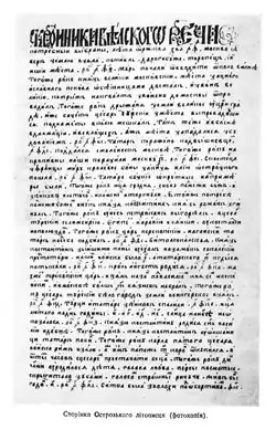 The Ostroh Chronicler (Ukrainian: Остро́зький літо́писець, romanized: Ostróz'kyy litópysets') is a Ukrainian chronicle of the late 30s of the 17th century.[1] The NASU Institute of Ukrainian Language has designated it as a monument of the Ukrainian language (Ukrainian: Пам'ятка української мови, romanized: Pam'yatka ukrajins'koj movy[2]).