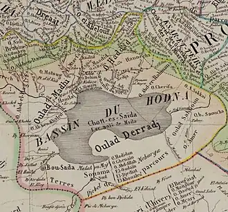 After El Derradji, other marabouts from Saguia el-Hamra arrived: in the 15th and 17th centuries. The Athbedj and marabouts were joined by other groups: nomads from the South (including Ouled Naïl), Zibbans and Tell or Hodna. The entire mountainous area that surrounds Hodna to the North and North-East provided a large number of migrants: Ouled Maadid, Righa and Kabyles: the Bratikiya are from Kalaa of Ait Abbas or Zemmoura, the Amayers of Selman are from Mzita, the Menaifa of Berhoumm are partly Kabyles from Akbou and the Gaoua of Djezzar are Igawawen from Djurdjura.[1] Some groups are of Moroccan Jewish origin: the Hammari (Ouled Adi Guebala) and the Ouled Messaoud (Bou Hamadou). The reputation of the Ouled Derradj is bad: in the 18th century the traveler el Ouarthilâni judges them ignorant, brutal, quarrelsome and tyrannical for the sedentary people of Mdoukal. Their reputation has not changed in the 19th century.[1]