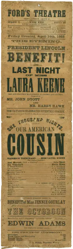 The play's 14 April 1865, performance at Ford's Theatre in Washington, D.C., became the most infamous in the play's history as the site of Abraham Lincoln's murder by John Wilkes Booth. The cast modified a line of the play in honor of the president: when the heroine asked for a seat protected from the draft, the reply – a pun on draft evasion scripted as, "Well, you're not the only one that wants to escape the draft" – was delivered instead as, "The draft has already been stopped by order of the President!"[11] Halfway through Act III, Scene 2, the character of Asa Trenchard, played that night by Harry Hawk, utters this line, considered one of the play's funniest, to Mrs. Mountchessington: