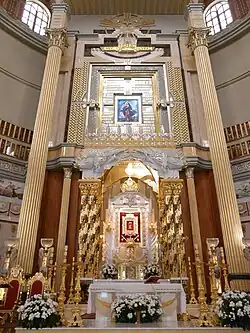 The basilica's organ created by Professor Andrzej Chorosiński and manufactured by the Zych company (157 stops, 6 manuals and pedalboard) is the largest instrument in Poland, the fourth largest in Europe and thirteenth-largest in the world.[5] In 2004, the marked golden protective altar frame was constructed for veneration. On 2 July 2006, the heavily guarded image was placed in the main altar of the basilica.