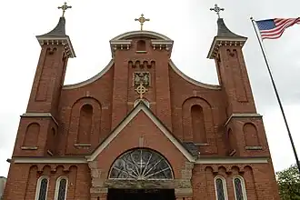Our Lady of Victory Roman Catholic Church, also known as Our Lady of Victory / St. Joseph Roman Catholic Church, is a historic Roman Catholic church located at Rochester in Monroe County, New York. It was designed by noted Rochester architect Andrew Jackson Warner and is a French Romanesque Revival style brick cruciform plan church built in 1868. It features two slender towers with concave roofs, a recessed entrance inside a single-story protruding section, and a semi-circular stained-glass window.[2]: 14, 56, 58