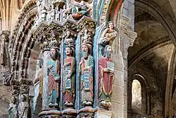The 13th-century Portico of Paradise (Pórtico del Paraíso) was built by students of Master Mateo who is best known for his Pórtico de la Gloria in the Cathedral of Santiago de Compostela. Its three arches are supported by slender columns with a central mullion. The apostle St James or Santiago holds a sword reminiscent of his alleged miraculous participation in the legendary Battle of Clavijo. The original 13th-century figure was replaced in the 19th century. The statue of the Virgin of Consolation (Virgen del Consuelo) with the body of Christ which tops the mullion was also added in the 19th century. Other decorations include Christ being tempted by the devil, a medallion of God the Father and a tabernacle presenting St Martin tearing his cloak. The archivolts of the central arch bear the figures of the 24 elders from the Book of Revelation. The columns themselves are sculpted with apostles and prophets while the capitals present a variety of figures including Christ's temptations in the desert, centaurs fighting mermaids, dragons and harpies with frightening faces who were said to have brought the plague. The vividly coloured pilaster figures were restored in the 18th century from the original Romanesque polychrome. The two Baroque side chapels contain a Castro Canseco altarpiece of the Nursing Madonna and a representation of San Francisco Blanco from Ourense who was crucified in Japan in 1597.[5]