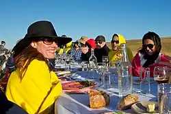 Outstanding in the Field was founded in 1999 by Jim Denevan. The first outdoor dining event took place on a small farm.[1] Denevan held three dinners in 1999, two in 2000, seven in 2002, and eight in 2003, which was the year he left his position as head chef at Gabriella Café. In 2004, he hired a staff and began touring the country full-time to hold Outstanding in the Field events.[2]