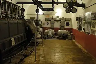 The fortification at Schoenenbourg is the one that saw the most combat between September 1939 and June 1940. Over this period, over 17,000 shells were fired from the fort, and it was itself the target of over 3000 shells and 160 bombs. Schoenenbourg was in action against the German 146th Infantry Division, which applied pressure along the Line.[20] On 19 June 1940, German Stukas attacked Schoenenbourg and other ouvrages, returning on the 20th and 21st. The attacks on the 21st were joined by a bombardment with 420 mm siege mortars, lasting three days. The bombardment cracked walls, but did not disable the position.[21] Schoenenbourg fired during this period in support of nearby casemates, not seriously affected by the bombardments. Schoenenbourg's turrets were retracted to receive the heavy shells, and raised during the lengthy reloading period for counterbattery fire. The inventory of German ordnance fired against Schoenenbourg was assessed after the armistice, and found to comprise 160 aerial bombs, 50 42 cm shells, 33 28 cm shells, and approximately 3000 smaller projectiles,[22] the most ammunition used against any fortification in France.[23] The final surrender of Schoenenbourg was effected on 1 July 1940, in accordance with the terms of the Second Compiègne armistice.[4][24][25] Following the surrender Schoenenbourg was used as a backdrop for propaganda films and as an indoctrination center for Hitler Youth.[26]