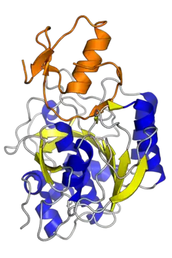 The third Kazal domain of the turkey ovomucoid protein (orange) bound to subtilisin Carlsberg, a serine protease.[1]
