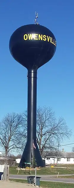 Owensville's uniquely black coated water tower in 2015. Recently been painted gold with the town's Kickapoo logo.