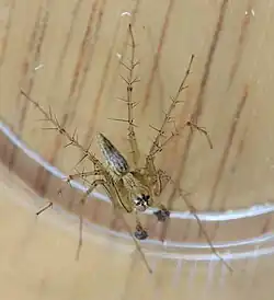 A number of authors (Brady 1964, Laster and Brazzel 1968, McDaniel et al. 1981, Young and Lockley 1985) have noted the importance of Oxyopids as a major predator of economically important agricultural pests. In 1961, Kayashima released 45,000 O. sertatus spiders into a Cryptomeria forest in Japan (in a test plot) and noted a 53% reduction in damage by the gall midge Contarinia inouyei.[3] Other studies in India (Sharma & Sarup, 1979; Rao et al., 1981) have noted similar results.[4] However, some studies note that O. salticus (and other Oxyopids) also prey on beneficial insects (e.g., bees and other pollinators), so their importance in pest control is somewhat questioned.[5]
