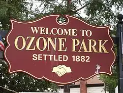 Advertisements for Ozone Park proclaimed that the development had "pure air" and "no malaria".[20] Ozone Park was called "the Harlem of Brooklyn" because at the time, as Harlem was a thriving Jewish and Italian neighborhood.[21] Hitchcock and Denton chose the "Ozone Park" name because in the 1880s, ozone was associated with breezes from the sea, and the Atlantic Ocean was located nearby.[18]