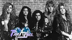 The band was featured on MTV and played with many of L.A.'s hottest Sunset Strip bands like Warrant, Tuff, Bang Tango, Hurricane, and many more. There were two bands with similar names playing the Strip at this time that created a bit of a controversy. One was Paradise, the other was Pair-A-Dice.[3] In 1989 the band did a short tour of Japan with Jetboy. Shortly after the return from Japan lead singer Paul Lancia left to start a solo career with his band called Lancia.[1] Billy D'Vette took over as the lead singer and the band continued for a short time but Dave Marshall was asked to join Brunette and the band parted ways. Billy D'Vette later replaced Marc Ferrari in Cold Sweat.[4] Dave Marshall joined Fiona to record the album Squeeze in 1991. He then joined Vince Neil's (Mötley Crüe) solo band [5] featuring Steve Stevens, Robbie Crane and Vik Foxx and toured with Van Halen. Daz Bash played drums for the Alice Cooper video "I Got a Line on You" for the movie Iron Eagle II.